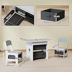 ¿Cansado del desorden en la sala de juegos y preocupado por las esquinas afiladas? Este conjunto de mesa y sillas infantiles de AIYAPLAY crea un espacio seguro para que tu hijo juegue y aprenda. Con seis cajones para guardar juguetes y material escolar, ayuda a mantener todo organizado. Su diseño resistente y esquinas redondeadas garantizan seguridad y tranquilidad, para que disfrutes de cada momento de creatividad. Características: ● Conjunto de mesa y sillas infantil para juegos creativos y actividades educativas ● Incluye 6 grandes cajones de tela, fomentando buenos hábitos de organización ● Fabricado en MDF P2 con esquinas redondeadas para mayor seguridad durante el juego ● Altura adecuada para niños de 3 a 8 años ● Este conjunto de mesa con sillas infantil con diseño moderno con estrellas grabadas que se adapta fácilmente a cualquier decoración ● Superficie pintada lisa, fácil de limpiar, ahorrando tiempo ● Adecuado para dormitorio, sala de estar, sala de juegos y guardería ● Montaje sencillo, con un tiempo aproximado de 40 minutos ● Nota Importante: No realizamos envíos a las Islas Canarias, Ceuta y Melilla, ni a las Azores y otras islas de Portugal Especificaciones: ● Color: gris y blanco ● Material: MDF, tela no tejida (non woven) ● Medidas de la mesa: 80x48x49 cm (LxANxAL) ● Medidas de las sillas: 28,5x30,5x53 cm (ANxPxAL) ● Encimera de la mesa: 80x48 cm (LxAN) ● Medidas del asiento: 28,5x30,5x26 cm (ANxPxAL) ● Medidas de los compartimentos: 30x19,5x13 cm (bajo la mesa), 25x24,5x12 cm (bajo la silla) ● Edad recomendada: 3-8 años ● Carga máxima: 20 kg (mesa), 30 kg (cada silla) ● Referencia: 312-151V80LG ● 1 x Mesa infantil ● 2 x Silla ● 1 x Manual de instrucciones