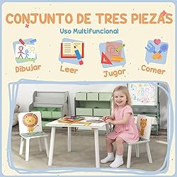 Haz que cada día sea más divertido para los peques con este conjunto infantil de 3 piezas de AIYAPLAY. Perfecto para niños a partir de 3 años, es ideal para pintar, leer o jugar en casa o en el cole. Su diseño en color verde con dibujos de leones aportará alegría al entorno, mientras que su estructura de madera y cantos redondeados ofrece seguridad. Fácil de mover, encaja en cualquier rincón de casa o espacio infantil. Características: ● Esta mesa infantil con sillas de AIYAPLAY incluye una mesa y dos sillas a juego, ideal para espacios de juego en casa o en la escuela ● Tiene un diseño en color verde con leones, pensado para estimular la imaginación infantil ● El pupitre infantil cuenta con esquinas redondeadas para mayor seguridad durante el juego diario de los más pequeños ● La altura está pensada para que los niños se sienten con comodidad y desarrollen su autonomía ● Tiene una estructura de madera maciza, estable y ligera, fácil de mover sin esfuerzo ● Es perfecto para dormitorios infantiles, salas de juegos o espacios educativos ● Viene desmontado, pero su montaje es sencillo y rápido ● Nota Importante: No realizamos envíos a las Islas Canarias, Ceuta y Melilla, ni a las Azores y otras islas de Portugal Especificaciones: ● Color: verde ● Material: MDF y madera de pino ● Medidas de la mesa: 60x60x44 cm (LxANxAL) ● Medidas de las sillas: 26,5x26,5x50 cm (LxANxAL) ● Altura del asiento: 26 cm ● Respaldo: 26x24 cm ● Carga máxima: 20 kg (mesa), 30 kg (cada silla) ● Edad recomendada: a partir de 3 años ● La normativa y seguridad: EN71-1-2-3 ● Referencia: 312-139V80GN ● 1 x Mesa infantil ● 2 x Silla infantil ● 1 x Manual de instrucciones