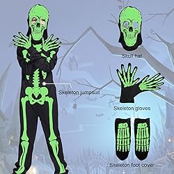 El disfraz de esqueleto que brilla en la oscuridad es perfecto para trucos o golosinas de Halloween, disfraces de esqueleto, cosplay de zombi, disfraces de esqueleto para carnaval, juegos de rol infantiles y fiestas de terror, entre otros. El mono de esqueleto con cremallera para niños presenta huesos realistas y una capucha desmontable, lo que facilita su colocación. Los ojos y la nariz de la capucha están ahuecados para que no obstruyan la respiración. La máscara de esqueleto también se puede usar sola y crea una atmósfera de terror de Halloween. El disfraz, la máscara y los guantes de esqueleto están estampados con huesos de calavera blancos que brillan en verde en la oscuridad. Exponga el disfraz a la luz solar antes de usarlo para un mejor efecto. Talla S: 98-110 cm (3-5 años), Talla M: 110-120 cm (5-7 años), Talla L: 122-134 cm (7-9 años), Talla XL: 135-145 cm (9-11 años), Talla XXL: 145-157 cm (12-13 años) Consulta nuestra "Tabla de Tallas" antes de comprar para asegurarte de que el disfraz te quede perfecto.