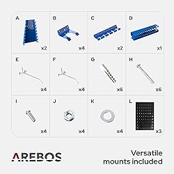 Arebos Pared de herramientas de 3 piezas perforada para taller, juego de ganchos y soportes de 17 piezas, 117,6 x 59,5 x 2 cm, pared perforada de metal para herramientas de taller, incluye material de