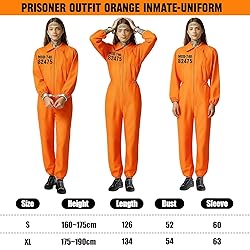 Nombre del producto: Axinyijia Disfraz Prisionero Naranja para Hombre Mujer, Mono Naranja Disfraz Preso para Halloween Cosplay Carnaval, Costume de Convicto Unisex Specificación: Material: Poliéster de alta calidad Color: Naranja/Negro Talla: Disponible en dos tallas (hombre/mujer) Dimensiones: Consulta la tabla de tallas La confezione include: Mono Naranja Disfraz Preso x 1