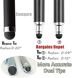 Modelo: [0,18 pulgadas Smaill Serie Tip] 2-en-1 lápiz / Agujas Color: (Negro / Azul / Violeta / Rojo) ACERCA DE LA AGUJA Longitud: 5,5 "(140 mm); Pluma diámetro del tubo de 0,37 "(9,5 mm); El diámetro pequeño punta de goma: 0,18 "(4,5 mm) - uno de los extremos El diámetro de la punta de goma delgada Segundo: 0,24 (6 mm) - Otro fin Peso: 20g cada lápiz Caucho punta Característica: reemplazable Material: Fabricado en acero inoxidable y aluminio, no hay piezas de plástico, sensación de lápiz real Compatibilidad: La Stylus/Bolígrafos digitales es 100% compatible con todos los dispositivos con pantalla táctil capacitiva; Apple, Android y Windows Smartphone y de la tableta 5V; (Compatible con iPad 1 y 2, iPhone, iPod, Kindle Fire, Kindle Touch, tableta de Motorola Xoom, Galaxy, y Blackberry Playbook Virtuoso Touch) Especificaciones de Stylus: En comparación con las puntas lápiz capacitivo regulares Gangas Depot pequeños consejos de radio - 0,09 pulgadas y 0,12 pulgadas consejos lápiz capacitivo regulares - 0.20 pulgadas Por favor Nota: El lápiz Ofertas Depot tiene una pequeña punta de goma, pero no hay que confundir con una punta de lápiz de punta fina! ¿Qué hay en el paquete? 4 piezas lápices ópticos de carga (Negro / Azul / Violeta / Rojo) 12 Piezas 4.5 mm puntas de goma 8 Piezas de 6 mm puntas de goma Nota: Por favor amablemente permitir 1mm-1.5mm diferencia debido a la medida manual, gracias por su comprensión!