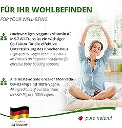 Los productos MoriVeda Vitamin D3 + K2 + Mg contienen vitamina D3 natural del liquen, vitamina K2 del Natto y magnesio; esta es una combinación única hasta ahora. La vitamina D3 participa en muchos procesos metabólicos del cuerpo. Entre otras cosas, promueve la absorción de calcio del tracto digestivo y el endurecimiento de los huesos. Está involucrado en el metabolismo del calcio y el fosfato y tiene un papel regulador en el sistema inmunológico. El cuerpo solo puede producir vitamin D por sí mismo si hay suficiente luz solar (radiación UVB) durante un período de tiempo más largo. Esto es difícil de lograr en un estilo de vida occidental moderno típico. La vitamina K2 apoya, similar a la vitamina D3, el metabolismo del calcio y asegura que el calcio se distribuya en el cuerpo. Un metabolismo saludable del calcio es importante para la protección contra depósitos vasculares, huesos y dientes fuertes y sanos, y un metabolismo energético normal. Magensium actúa en la fórmula como activador de la vitamina D3. Tiene una variedad de funciones en el cuerpo humano, tiene un efecto relajante y antiinflamatorio. Como mineral esencial, el magnesio participa en el metabolismo energético. También apoya la función muscular y nerviosa y el mantenimiento de huesos y dientes sanos. Especialmente las personas con enfermedades crónicas, diabéticos, mujeres embarazadas, mujeres que amamantan y atletas de competición tienen un mayor requerimiento de magnesio. La combinación única de MoriVeda D3 + K2 + Mg asegura que las vitaminas sean absorbidas de manera óptima por el cuerpo. El magnesio es un mineral importante para las sustancias mensajeras que la vitamina D3 transporta por el cuerpo. En caso de deficiencia de magnesio, la vitamina D3 absorbida no puede ser transportada por el cuerpo al destino final correspondiente. La ingesta conjunta de vitamina K2 garantiza la activación de las proteínas de la vitamina D3. Solo en la combin