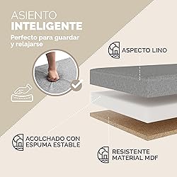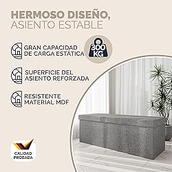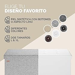 Banco y caja de almacenamiento 2en1: Orden y comodidad en el hogar:El versátil arcón está fabricado con robusto MDF y se destaca por ser multifunción. No sólo le ofrece un lugar de almacenaje, sino que también es un cómodo asiento o taburete.La tapa se puede abrir por ambos lados, por lo que se pueden sacar o meter objetos de forma rápida y práctica. El asiento está bien acolchonado asegurando comodidad al sentarse. Además, gracias al fondo interior se protegen los objetos de la humedad.El baúl de almacenaje viene en L y XL y tienen una capacidad de 100 y 131 L respectivamente, ofreciendo un amplio espacio de almacenamiento, ideal para guardar de manera ordenada y segura juguetes, libros, ropa, zapatos y mucho más.Otra ventaja, es que si ya no se necesita, se puede plegar y ahorrar espacio a la hora de guardarlo o transportarlo. Además, la superficie es muy fácil de limpiar.El cofre de almacenaje tiene un diseño muy atractivo, y gracias a su variedad de colores es muy fácil de combinar con el resto del mobiliario.Ventajas del producto:PlegableMucho espacio de almacenamientoTapa desmontable y se puede abrir por ambos ladosAsiento tapizadoSuperficie de fácil cuidado y repelente al aguaEl suelo del baúl impide el paso de la humedadDatos técnicos:Dimensiones (LxAxA) XL: 115x38x38cm - L: 80x40x40cmDimensiones plegadas (LxAxA): XL 115x38x7cm - L: 80x40x7cmVolúmen: XL: 131L - L:100LCapacidad de carga estática máx.: 300 kgSuperficies del material: 100% poliéster (gris, gris oscuro)Superficies del material: 100% policloruro (blanco, marrón, negro)Material de la superficie interior: 100% poliésterMaterial del marco: MDFColores disponibles: Blanco, Negro, Marrón, Antracita, Gris claro.Incl