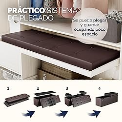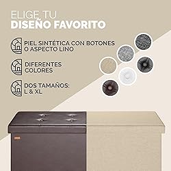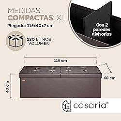 Banco y caja de almacenamiento 2en1: Orden y comodidad en el hogar:El versátil arcón está fabricado con robusto MDF y se destaca por ser multifunción. No sólo le ofrece un lugar de almacenaje, sino que también es un cómodo asiento o taburete.La tapa se puede abrir por ambos lados, por lo que se pueden sacar o meter objetos de forma rápida y práctica. El asiento está bien acolchonado asegurando comodidad al sentarse. Además, gracias al fondo interior se protegen los objetos de la humedad.El baúl de almacenaje viene en L y XL y tienen una capacidad de 100 y 131 L respectivamente, ofreciendo un amplio espacio de almacenamiento, ideal para guardar de manera ordenada y segura juguetes, libros, ropa, zapatos y mucho más.Otra ventaja, es que si ya no se necesita, se puede plegar y ahorrar espacio a la hora de guardarlo o transportarlo. Además, la superficie es muy fácil de limpiar.El cofre de almacenaje tiene un diseño muy atractivo, y gracias a su variedad de colores es muy fácil de combinar con el resto del mobiliario.Ventajas del producto:PlegableMucho espacio de almacenamientoTapa desmontable y se puede abrir por ambos ladosAsiento tapizadoSuperficie de fácil cuidado y repelente al aguaEl suelo del baúl impide el paso de la humedadDatos técnicos:Dimensiones (LxAxA) XL: 115x38x38cm - L: 80x40x40cmDimensiones plegadas (LxAxA): XL 115x38x7cm - L: 80x40x7cmVolúmen: XL: 131L - L:100LCapacidad de carga estática máx.: 300 kgSuperficies del material: 100% poliéster (gris, gris oscuro)Superficies del material: 100% policloruro (blanco, marrón, negro)Material de la superficie interior: 100% poliésterMaterial del marco: MDFColores disponibles: Blanco, Negro, Marrón, Antracita, Gris claro.Incl