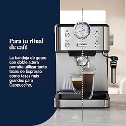 De'Longhi Classic EM450.M es una máquina de espresso elegante y eficiente, diseñada para los amantes del café. Cuenta con un sistema de calefacción Thermoblock para un calentamiento rápido y una temperatura estable, junto con una bomba de 15 bares para una extracción perfecta del espresso. Puedes preparar dosis simples o dobles y personalizar la longitud de tu café según tu gusto. La máquina incluye un sistema de cappuccino de acero inoxidable con una boquilla flexible de 360°, lo que te permite hacer leche caliente o cremosos cappuccinos sin esfuerzo. El panel de control fácil de usar tiene cuatro botones iluminados para una operación sencilla y un botón para seleccionar vapor o agua caliente. Un manómetro proporciona control total sobre la extracción del café. Con un cuerpo completamente metálico y detalles cromados, el EM450.M es tanto estiloso como duradero. Incluye una bandeja recogegotas extraíble para vasos más grandes y un tanque de agua removible de 1.7 litros. Accesorios como un prensador plástico y cuchara, junto con canastas filtrantes de doble pared, completan esta versátil máquina de espresso.