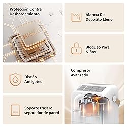 Capacidad de deshumidificación: 16 L/día (a 35 °C, 90 % H.R.) Capacidad del depósito: 3,3 L Área recomendada: 45 m² / 110 m³ Temperatura de funcionamiento: 5 °C – 35 °C Refrigerante: R290 (respetuoso con el medio ambiente) Voltaje: 220–240 V Potencia: 220–260 W Modos: Automático: humedad y velocidad ajustables, luz encendida Secado: humedad fija, velocidad alta, luz encendida Deshumidificación continua: humedad fija, velocidad ajustable (alta/baja), luz encendida Sueño: humedad fija, velocidad baja, luces apagadas Humedad ajustable: 30 % – 80 % H.R. 2 velocidades de ventilador: Alta / Baja Indicador LED de humedad: Azul = seco (<50 %) Verde = confortable (50 – 70 %) Rojo = húmedo (> 70 %) 2 modos de drenaje: depósito / manguera Seguridad: protección contra desbordamiento, bloqueo infantil, diseño a prueba de fugas Diseño práctico: filtro extraíble, panel táctil, control digital inteligente Movilidad: asa de cuero suave, ruedas de 360°, almacenamiento de cable integrado Funciones de confort: reinicio automático, temporizador de 24 h, función de memoria Ingeniería alemana: descongelación automática, diseño de ahorro energético (-30 %), larga durabilidad
