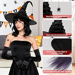 Disfraz Bruja Mujer, Capa Negra con Capucha 170cm, Sombrero Bruja, Guantes Largos, Escoba, Tatuajes de Arañas como Accesorios para Disfraces Witch adulto para Halloween, Carnaval