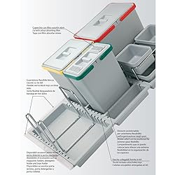 Organizador para basura de apoyo en el cajón completamente de plástico. Línea de vegetal de diseño y praticissime. Organizarse en su simplicidad permiten los espacios del propio cajón como mejor se preferisce. Las superficies con los divisores movibles le permiten riorganizzare los contenedores como más se preferisce y los restantes espacios libres pueden esser utilizados para stoccare detersivi, bolsas, tapones y otro quant' necesario para la limpieza. Al interior están presentes los recipientes de filtro para un total de 15 + 15 Litros. Un contenedor es siempre dispone de tapa con filtro lavable divora olores (hasta 50 veces). Hecho para reinsertar autónoma dentro de sus bases de cocina con cajón, este artículo dispone de juntas flexibles externas que permiten respetar el cajón de cada eventuale restante de suciedad que accidentalmente puede salir de los contenedores y permite autoadattarsi sus medidas interiores del cajón. Instalación sencilla y montaje rápido gracias a los accesorios a presión; posteriormente solo de Apoyo en el cajón. Módulo para cajones de 60 cm de dimensión externa.
