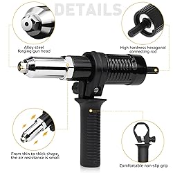 Características- La cabeza estáfabricada en aleación de acero para proporcionar unagran fuerza de sujeción y estáequipada con un mango vertical que permite insertar remaches ciegos de forma rápida y sencilla.- El accesorio para remaches es compatiblecon brocas hexagonales estándar de 1/4» y puedeutilizarse con taladros, atornilladores y atornilladores inalámbricos estándar.Especificaciones del productoMaterial: carburo de tungstenoColor: NegroEl paquete contiene1 x cabeza de conversión4 x cabezas de remache1 mango1 x llave10 x remaches (2.4*8mm)10 x remaches (3.2*8 mm)10 remaches (4,0*8 mm)10 remaches (4,8*8 mm)ConsejosPor favor, preste atención al tamaño antes de comprar, si usted tiene alguna pregunta acercade nuestros productos, póngase en contacto connosotros.
