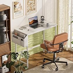 HLFURNIEU 80 x 40 cm Escritorio, Mesa Escritorio Pequeña con Bolsa de Almacenaje, Mesa Ordenador, para Oficina en Casa, Sala de Estar, Espacios Pequeños, Estructura Metal, Blanco