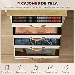 ¿Te falta espacio para guardar cosas y no sabes dónde ponerlas? Esta cómoda de HOMCOM te lo pone fácil: tiene cuatro cajones amplios para organizar tu ropa, bolsillos laterales para pequeños objetos y una estructura robusta que se adapta incluso a suelos irregulares. Además, su diseño sencillo y funcional encaja muy bien en cualquier dormitorio. Ideal si buscas una solución práctica y decorativa para el día a día. Características: ● Esta cómoda incluye cuatro cajones de tela del mismo tamaño, perfecta para guardar ropa o accesorios del día a día ● Los bolsillos laterales y ganchos te permiten tener a mano los objetos esenciales del día a día, haciendo esta cajonera pequeña aún más práctica ● La encimera puede usarse para mostrar fotos, plantas o aromaterapia, añadiendo un toque decorativo ● La estructura de acero reforzado con barras en X evita movimientos y mejora la resistencia ● Las patas ajustables y el sistema anti-vuelco garantizan mayor estabilidad y seguridad ● Los cajones plegables de tela son fáciles de guardar cuando no los usas ● Las asas cómodas facilitan abrir y cerrar los cajones ● Requiere montaje ● Nota Importante: No realizamos envíos a las Islas Canarias, Ceuta y Melilla, ni a las Azores y otras islas de Portugal Especificaciones: ● Color: beige, blanco y efecto madera ● Material: tela no tejida, acero y melamina de madera ● Medidas totales: 45x30x94,5 cm (LxANxAL) ● Medidas de los cajones: 39x28x20,5 cm (LxANxAL)(internas) ● Medidas de bolsillo lateral: 29x86 cm (LxAL) ● Altura al suelo: 8,5 cm ● Carga máxima: 20 kg (total), 10 kg (encimera) y 3 kg por cajón ● Referencia: 83D-064V00BG ● 1 x Cómoda ● 4 x Bolsillo de almacenamiento ● 2 x Gancho ● 1 x Manual de instrucciones