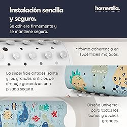 Alfombrilla antideslizante para bañera Homerella: 40 x 16 pulgadas, resistente al moho y al moho, para niños y adultosEvite resbalones y caídas con la alfombrilla antideslizante para bañera Homerella. Con más de 200 ventosas y una superficie texturizada, ofrece un agarre seguro para niños y adultos, incluso cuando se utiliza champú o jabón. Con unas dimensiones de 40 x 16 pulgadas, la alfombrilla se adapta a la mayoría de bañeras y duchas. La alfombrilla cuenta con grandes orificios de drenaje que permiten que el agua se escurra libremente, lo que ayuda a mantenerla seca y fresca. Es fácil de limpiar y lavable a máquina. Se incluyen dos ganchos adhesivos extraíbles para colgarla y secarla fácilmente, lo que le permite mantener su cuarto de baño ordenado. Fabricada con materiales suaves e inodoros, esta alfombrilla de baño ofrece comodidad y seguridad para toda la familia. Disfrute de una experiencia de baño más segura y agradable.