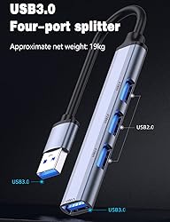 Hub USB con 1 puerto USB 3.0 y 3 puertos USB 2.0 Con 4 puertos USB: 1 USB 3.0 y 3 USB 2.0: 5,0 Gbps para el 3.0 y 480 Mbps para el 2.0. No recomendamos utilizar el puerto USB 3.0 para cargar el teléfono o la tableta, ya que los 4 puertos USB A admiten la carga rápida de 5V /1,5A por separado. Más eficiente, sin lag: conéctese a un teclado y ratón externos sin lag, conéctese fácilmente a un teclado y ratón inalámbricos/con cable para Internet/juegos sin lag Alta eficiencia, transmisión estable: un núcleo más grueso es más estable, utilizando un núcleo de cobre estañado más grueso, más papel de aluminio, trenza de metal, etc. para formar una capa de blindaje de alta densidad, la pérdida de señal de transmisión es pequeña. Carcasa de aleación de aluminio, rápida disipación del calor, transmisión más estable, textura metálica, tacto delicado Resistente al desgarro y a la flexión, más duradero y robusto Protección de alambre engrosado, material de pvc engrosado, almacenamiento diario de flexión repetida, no tiene miedo de romperse, resistente a la flexión, mejora de refuerzo de las juntas, no se agrieta, cuerpo de alambre engrosado de 4,5 mm Compacto y portátil: con un peso aproximado de 19 g, el diseño compacto del adaptador portátil, con una longitud de cable de 6,5 cm, permite conectar el adaptador a una longitud suficiente y llevarlo a todas partes