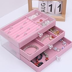 Joyero, organizador de joyas con 5 cajones de almacenamiento, caja de acrílico para collares, apiladores, joyero, almacenamiento de joyas, para anillos, aretes, collares, pulseras, beige (rosa, 3