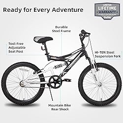 JOYSTAR La bicicleta de montaña infantil Contender de 20 pulgadas es una auténtica bicicleta de montaña que también es una bicicleta infantil de 20 pulgadas. Los diseñadores del Contender no se detuvieron ni un poco mientras seleccionaban componentes. El resultado es el epítome de las bicicletas de montaña infantiles. La suspensión delantera y trasera completa para bicicleta hace posible una gran variedad de aventuras. También viene con el freno en V delantero y trasero para una parada fiable. Esta es una de las mejores bicicletas de montaña cuesta abajo para niños que puedes obtener.