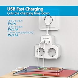 Especificaciones: Voltaje de funcionamiento: 110-250 V~ 16 A Potencia máxima: 3680 W Salida USB-A: 5 V/2,4 A máx. (12 W) Salida USB-C: 5 V/3 A máx. (15 W) Salida total USB: 5 V/3,4 A (17 W) Materiales: PC+ABS (retardante de llama a 750 ℃) Dimensiones: 11,3 x 10,8 x 4 cm Indicador LED: azul Modelo: JSVER-OT2043 Características: Con 2 salidas de CA, 2 puertos USB-A y 2 puertos USB-C, el usb regleta de pared transforma su toma de corriente habitual en una estación de carga multipropósito eficiente y alimenta Todo, desde la mayoría de los electrodomésticos hasta tu teléfono. Los dos puertos USB-C pueden proporcionar 5 V/3 A de potencia de carga, mientras que los dos puertos USB-A pueden proporcionar hasta 5 V/2,4 A de potencia de carga. Construido con una carcasa resistente ignífuga para garantizar un uso y durabilidad a largo plazo. Las tapas de seguridad mantienen cerradas las tomas de corriente no utilizadas mientras no se utilizan, lo que protege a tus hijos y mascotas de cada toma de corriente no utilizada. Una solución excelente para viajar si necesitas enchufes de alimentación adicionales y un cargador USB. Proporciona suficientes tomas de corriente para manejar varios dispositivos a la vez, ya sea en la habitación del hotel, la terminal del aeropuerto o la cafetería. El paquete incluye: 1 x JSVER Regleta USB 2 Tomas 1 x Manual del usuario
