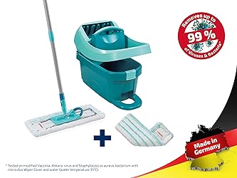 Cubo de fregar con ruedas y mopa ultrafina Profi XL de Leifheit, Limpieza completa sin esfuerzoQuieres un set de limpieza profesional que te permita limpiar sin mancharte ni agacharte? Con este Set de Leifheit, podrás mantener la casa limpia de forma rápida y sencilla. El cubo portátil dispone de una práctica prensa para escurrir la mopa que se acciona con el pie y de unas cómodas ruedas que permiten transportarlo con facilidad. Para dejar la mopa óptimamente escurrida, solo tienes que soltar la funda de lavado del soporte pisando el pedal, introducir la funda en la prensa, accionarla con el pie y volver a colocar la funda en el alambre.Por otra parte, las fibras dobles de la funda de la mopa se encargan de desincrustar la suciedad más difícil, ya que llegan incluso a los poros más profundos. La mopa tiene una articulación en plano y una articulación giratoria de 360° para limpiar en zigzag que te permitirán limpiar debajo de los muebles y rodear las patas de mesas y armarios. Además, la anchura de barrido de 42 cm es óptima para limpiar superficies grandes. El escurridor grande dispone de unas prácticas ruedas en la parte inferior para moverlo sin esfuerzo por las diferentes zonas de la casa.Características del producto en detalleSet de prensa y mopaCubo con ruedasPalo de acero de 3 piezasFunda con doble fibra para limpiar en profundidadPrensa de accionamiento con el pieLimpieza sin esfuerzo, sin agacharse y sin mojarse las manosArticulación giratoria de 360° y articulación en planoAnchura de pasada de 42 cmIncluye funda de repuesto