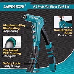 LIBRATON herramienta de tuerca de remache con una sola mano es perfecta para una amplia gama de aplicaciones de remachado.El mango ergonómico de aleación de aluminio de 9.5 pulgadas puede lograr maximizar el apalancamiento, haciendo que la pistola remachadora ahorre más trabajo.Modo de empleo:Paso 1: Seleccione el mandril de tamaño correcto y empuje en la parte superior de la pistola remachadora de tuerca.Paso 2: atornilla la pieza nasal.Paso 3: taladre el agujero del tamaño correcto en las piezas de trabajo.Paso 4: abre el mango y luego atornilla la tuerca del remache en el mandril.Paso 5: Inserte la tuerca del remache en las piezas de trabajo.Paso 6: Apriete el mango para hacer que la tuerca del remache fije la pieza de trabajo. (Asegúrate de que la tuerca del remache esté firmemente fijada en la pieza de trabajo al apretar).Paso 7: Gire la perilla en sentido contrario a las agujas del reloj para desenroscar el mandril de la tuerca de accionamiento.Paso 8: la herramienta de remache de tuerca ha terminado su trabajo y puede sujetar un tornillo en la tuerca de transmisión.Contenido del paquete:1 herramienta de tuerca de remache manual de 9.5 pulgadas (con 4 piezas de nariz intercambiables).4 mandriles métricos intercambiables (M3, M4, M5, M6)40 tuercas de remache (10 unidades de cada tamaño).1 funda de transporte moldeada por soplado.