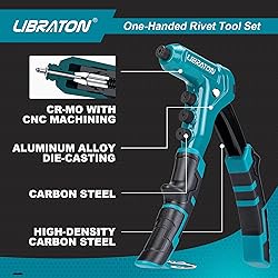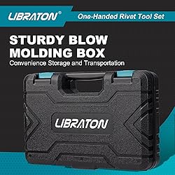 LIBRATON KIT DE HERRAMIENTAS DE REMACHADORA CON UNA SOLA MANOFunciones:El grueso mango cubierto de TPR proporciona una sujeción más cómoda. El diseño curvo ergonómico del mango permite que la pistola de remaches ahorre más mano de obra.El kit de remachadora de ráfaga viene con 4 boquillas de puede reemplazar sin herramientas para facilitar el mantenimiento y hace que su trabajo sea más eficiente.El cuerpo principal está compuesto de fundición a presión de aleación de aluminio, que es fuerte y duradero, y dura una larga vida útil.200 remaches (50 cada tamaño) proporcionan soluciones profesionales para diversos proyectos de remachado.La remachadora manual tiene el tamaño adecuado para que pueda operar con una mano.La robusta caja de moldeo por soplado proporciona portabilidad, manteniendo las herramientas y los remaches organizados y protegidos.El Paquete Incluye:1 x Pistola de remache (con boquillas en 4 tamaños)1 x Boquilla de extracción200 x Remaches (cada uno 50 de 2,4 mm / 3,2 mm / 4,0 mm / 4,8 mm)4 x Brocas (2,4 mm / 3,2 mm / 4,0 mm / 4,8 mm)1 x Caja de moldeo por soplado