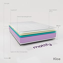 El colchón viscoelástico reversible Kloe de Mattfy (cara invierno-verano), combina un núcleo de espuma HR de alta densidad y excelente firmeza y gran recuperación, muy transpirable, que aporta la firmeza y flexibilidad adecuadas para un buen descanso y un buen apoyo de la columna; también incorpora 2 cm de: viscoelástica de altísima calidad + viscosoft + fibras hipoalergénicas, con un acolchado acogedor, que ayuda a liberar la tensión muscular y mejorar la calidad de nuestro descanso; en la cara de invierno incorpora tejido strech de alta calidad, suave y transpirable, y en la cara de verano incorpora tejido 3d súper transpirable; incorpora tratamientos antialérgicos que nos protegen de ácaros, bacterias y hongos. Producto de confianza, fabricado en España, con las últimas tecnologías y certificaciones de calidad; certificados Oeko-tex y Certipur, que acreditan una fabricación sostenible y libre de sustancias nocivas. Tu bienestar y el de los tuyos es lo primero. Altura total del colchón 20cm +/- 2cm