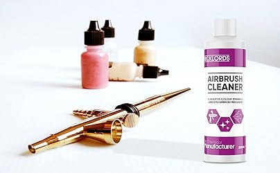 Puedes usar el limpiador de aerógrafo McKLords para cambios de color o cuando hayas terminado el trabajo. Lubrica el interior del aerógrafo para ayudar a mantenerlo funcionando sin problemas. Para una limpieza más profunda, remoja la válvula y la boquilla (no todo el aerógrafo) durante varias horas y luego enjuaga con agua. Si se utiliza para enjuagar la pintura entre cambios de color, diluye con agua al 50 %.