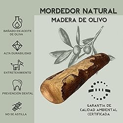 Cada vez que adquieres nuestro mordedor natural de madera de olivo para perro, ayudas a preservar el medio ambiente y evitas consumir uno fabricado en plástico. Aprovechamos la madera 100% natural procedente de la poda anual de olivos de la provincia de Jaén para poder ofrecer un producto ecológico, sostenible y que cuenta con el Distintivo de Garantía de Calidad Certificado por la Generalitat de Cataluña (España) Bañado en aceite de oliva virgen y con trozos de corteza, tu perro agradecerá este juguete que además le aportará nutrientes básicos y una forma de mantener sana su dentadura (ayuda a reducir el sarro) y además podrás preservar los muebles de tu hogar de picaduras no deseadas La dureza y resistencia del mordedor lo hacen ideal para entretener a perros con inclinación a morder y favorece la dentición de los cachorros. La madera de olivo no se astilla sino que poco a poco se convierte en pulpa y las astillas y cortezas que desprende son inofensivas para tu mascota. Adjuntamos una tabla con las características aproximadas de los diferentes mordedores para que puedas elegir el que mejor se adapta a las características de tu perro (la forma y grosor del producto puede variar ligeramente dada la naturaleza de la madera) Si el palo se rompe (algo muy inusual) reemplácelo inmediatamente