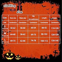 Este vestido de Halloween de Vampiro Royal Deluxe para niña (Talla S, altura 110-120 cm, 5-7 años) vestido largo negro y rojo con escote rubí y tres pegatinas que brillan en la oscuridad. Su diseño gótico, con corte recto y estampado rojo sangre, crea al instante una imagen de vampiro noble y misteriosa. Su tejido suave y transpirable es cómodo y fácil de usar, perfecto para fiestas de Halloween, celebraciones temáticas y otros eventos. Tallas disponibles (consulta la tabla de tallas en la imagen para elegir la que mejor se adapte a tus necesidades): Talla S, altura 110-120 cm, 5-7 años Talla M, altura 120-130 cm, 8-10 años Talla L, altura 130-145 cm, 10-12 años