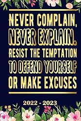 Never complain, never explain Resist the temptation to defend yourself or make excuses Planner 2022 2023: Daily Weekly and Monthly with 24 Months Calendar, Vision Boards, To Do Lists, Notes