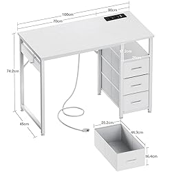 ODK Escritorio con Puerto y Toma de Carga USB, 100x48x75,5cm Escritorio para Ordenador con 3 Cajones de Tela, Mesa de Oficina, Mesa de Oficina de Madera para Oficina, Salón, Hogar, Oficina, Blanco