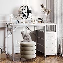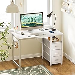 Escritorio para computadora ODK con tres cajones de tela, escritorio, escritorio para computadora con dos enchufes y dos puertos USB, escritorio de estudio reversible Este escritorio para computadora está equipado con 2 tomas de corriente y 2 puertos de carga USB, que es conveniente para cargar su teléfono móvil, dispositivo de juego o dispositivo Bluetooth mientras trabaja o juega. No hay necesidad de preocuparse de que su dispositivo se quede sin energía, ya sea que esté trabajando o jugando durante mucho tiempo. El escritorio de la casa tiene 3 cajones de tela para mantener ordenados los suministros de oficina o estudio. Puedes optar por instalar los cajones a la izquierda o a la derecha según tus necesidades. El diseño reversible le permite personalizar libremente su espacio de trabajo según sus necesidades personales y también facilita el trabajo diario. Las patas de metal y el diseño del escritorio de madera de alta calidad garantizan la estabilidad y la alta capacidad de carga de este escritorio, y los pies de las patas pueden prevenir eficazmente rayones en el piso. También garantiza que no sea fácil resbalarse o sacudirse cuando está en uso, y puede usarlo como escritorio de computadora con cajones, mesa de estudio o incluso mesa de maquillaje. Para brindarle un mejor soporte y ayuda, siempre lo respaldamos y brindamos garantías confiables. Si tiene alguna pregunta sobre nuestros escritorios, no dude en contactarnos y le responderemos dentro de las 24 horas.