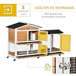 Esta jaula para conejos de exterior de PawHut es perfecta para conejos, cobayas y otros animales de tamaño similar. Esta elegante conejera de madera es una combinación ideal de seguridad y libertad y ofrece toda la comodidad de un hogar. La parte superior está diseñada para la intimidad y el descanso, mientras que la parte inferior ofrece más espacio para correr y jugar. Características: ● Malla de acero para asegurar un cercado seguro a la vez que favorece la ventilación ● Rampa que permite a los conejos entrar rápidamente en la zona de vivienda elevada ● 3 bandejas deslizantes extraíbles para facilitar la limpieza en general, 1 en la caseta principal y 2 en la zona para correr ● Varias puertas con cerradura para que puedas cuidar fácilmente de tus animales y permanezcan seguros cuando no estás ● Caseta para conejos adecuada para 1 a 3 conejos ● Se requiere montaje ● Nota Importante: No realizamos envíos a las Islas Canarias, Ceuta y Melilla, ni a las Azores y otras islas de Portugal Especificaciones: ● Color: madera natural, blanco, negro ● Material: madera maciza de abeto, acero ● Medidas totales: 157,4x53x99,5 cm (LxANxAL) ● Medidas de la caseta principal: 74x45,5x51 cm (LxANxAL) ● Medidas de la puerta: 30x26 cm (ANxAL) ● Medidas del área de carrera: 72x45,5x35 cm (LxANxAL)(principal) ● Medidas del área de carrera: 72x45,5x63 cm (LxANxAL)(lateral) ● Medidas de la puerta: 30x25/29x47,5 cm (ANxAL)(área de carrera) ● Medidas de la rampa: 61x14,8 cm (LxAN) ● Medidas de la bandeja deslizante: 70x43 cm (LxAN) ● Altura de las patas: 9,5 cm ● Diámetro de las ruedas: 3,7 cm ● Referencia: D51-314YL ● 1 x Conejera ● 1 x Manual de instrucciones
