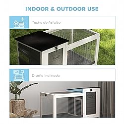 Facilita el cuidado de tus mascotas con la jaula para conejos de PawHut. Su diseño incluye una bandeja extraíble y suelo de alambre que simplifica la limpieza, manteniendo a tus animales limpios y cómodos. Sus ruedas permiten moverla fácilmente, y su techo resistente junto con múltiples accesos aseguran una protección completa para tus mascotas, en cualquier clima. Características: ● La conejera de interior es fácil de limpiar para mantener higiene ● Múltiples accesos para facilitar la interacción con las mascotas ● La casa para conejos tiene techos abatibles para una alimentación cómoda ● Techo de asfalto resistente al clima para protección contra la lluvia ● Espacio adecuado para 1 o 2 animales pequeños ● Nota Importante: No realizamos envíos a las Islas Canarias, Ceuta y Melilla, ni a las Azores y otras islas de Portugal Especificaciones: ● Color: gris oscuro, blanco, negro ● Material: madera de abeto, alambre de acero galvanizado ● Medidas totales: 91x51x66 cm (LxANxAL) (incluyendo los aleros) ● Área de la caseta principal: 0,122 m², medidas interiores: 39,5x31 cm (LxAN) ● Área del cercado: 0,20 m², medidas interiores: 39,5x51,5 cm (LxAN) ● Medidas de la caseta principal: 35,5x43,5x54 cm (LxANxAL), puerta frontal: 27x44,5 cm (ANxAL), ventana: 15x8 cm (ANxAL), tapa superior abatible ● Medidas del cercado: 53,5x43,5x47 cm (LxANxAL), tapa superior abatible ● Puerta de paso: 17x25 cm (ANxAL) (entre la caseta principal y el cercado) ● Medidas de la bandeja: 84x41 cm (LxAN) ● Referencia: D51-473V00GY - 1 x Jaula para conejos - 1 x Manual de instrucciones