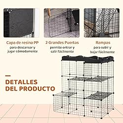 ¿Preocupado por la seguridad y comodidad de tus pequeños animales? Este parque para mascotas de PawHut crea un refugio espacioso y ventilado para conejos y cobayas. Su diseño modular se adapta a cualquier rincón del hogar, mientras la rampa y las puertas amplias facilitan el acceso y el cuidado diario. Características: ● Este parque para mascotas ofrece un espacio seguro y cómodo para cobayas, conejos y otros animales pequeños ● El recinto para conejos incluye conectores y almohadillas antideslizantes para mayor estabilidad y seguridad ● Las placas de resina PP del parque para mascotas crean una zona suave y fácil de limpiar para tus animales ● El diseño tipo castillo de esta jaula para conejos aporta un toque decorativo y se integra en cualquier hogar ● Las dos puertas grandes con cierre permiten un acceso sencillo y mantienen a tus mascotas protegidas ● Montaje rápido y sencillo, ideal para quienes buscan un parque para mascotas práctico ● No apto para hámsteres ni ratones ● Nota Importante: No realizamos envíos a las Islas Canarias, Ceuta y Melilla, ni a las Azores y otras islas de Portugal Especificaciones: ● Color: negro ● Material: metal, PP ● Medidas totales: 105x70x116 cm (LxANxAL) ● Medidas de la puerta: 35x35 cm (LxAN) ● Medidas de los paneles: 35x10 cm (ANxAL)(superior) ● Medidas de los paneles: 35x35 cm (LxAN)(simple) ● Referencia: D51-217 - 1 x Recinto de metal para pequeños animales - 40 x Panel - 9 x Panel superior - 1 x Rampa - 1 x Martillo - 12 x Almohadilla de protección - 47 x Conector - 1 x Set de abrazaderas - 1 x Manual de instrucciones