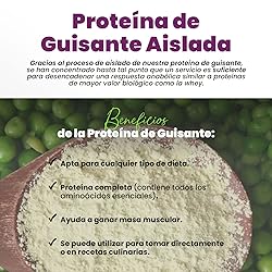 ¿Qué es Proteína de Guisante Aislada?Se trata de un suplemento a base de proteína en polvo procedente del guisante Fuente de Proteínas: Aporta más de 22g de proteína por servicio100% Vegetal: Apta para Veganos y Vegetarianos¿Por qué Tomar Proteína de Guisante Aislada?Contribuye con elevar el aporte de proteínas en la dietaEstimular la síntesis de proteínasAyudan en la mejora de la composición corporal: Perder Grasa y Mantener MúsculoFácil de tomar: se pueden mezclar con agua o incluso utilizar como parte de recetas¿Quién puede tomar Proteína de Guisante Aislada?Cualquier Persona Activa o Sedentaria que siga una dieta libre de alimentos de origen animalCualquier Persona que busca mantener unos hábitos alimentarios saludables y complementar su dieta con las necesidades de proteínas diarias.Cualquier Deportista o Atleta para acelerar su recuperación y potenciar la creación de nuevos tejidos musculares o el mantenimiento de masa muscular.