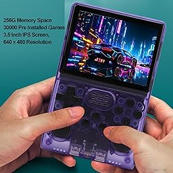 Especificaciones: Tipo de artículo: consola de juegos portátil Material del producto: ABS. Batería: batería de polímero de iones de litio de 3800 mAh (incorporada) CPU: RK3326 (64 bits Quad-Core). Para CPU Cortex-A35 de hasta 1,5 GHz). GPU: para Mali G31MP (520 MHz) Memoria: 256 G (admite tarjeta de memoria pequeña de 16 – 256 g). RAM: DDR3L 4 GB. Pantalla: pantalla IPS de 3,5 pulgadas Resolución de la pantalla: 640 x 480 Conector de alimentación: USB C OTG: Soporte (cable OTG no incluido) Conector Audible: conector para auriculares de 3,5 mm. Altavoz: altavoz incorporado de 8 W Permiso de cambio: en algunos juegos, puede cambiar el núcleo del emulador, ajustar la orientación y la escala de la pantalla, y aplicar filtros de pantalla. Aplicación: Saque el producto y enciéndalo para usarlo Contenido del paquete: 1 consola de juegos. 1 cable USB. 1 x Manual de usuario