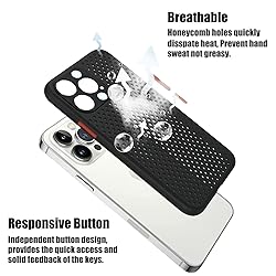Malla de enfriamiento: Un diseño especial de malla transpirable que ayuda a que el iPhone 14 Pro MAX libere el exceso de calor, mantenga su teléfono fresco y mejore la eficiencia operativa.Cobertura completa: Borde levantado de 0.3 mm para protección de la cámara, extremadamente protector mientras mantiene un diseño elegante, delgado y fácil de sostener, antideslizante y a prueba de rayones.Prueba de huellas dactilares: La funda flexible, flexible y sin huellas dactilares, se adapta a la palma de su mano con una sensación agradable y protege contra las huellas dactilares.Fácil de instalar: La funda ultradelgada se adapta al iPhone 14 Pro MAX y es muy fácil de instalar. El acceso a los.