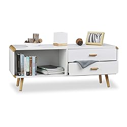Relaxdays Aparador Salón Nórdico con 2 Cajones, Mesa Auxiliar Baja, Mueble TV, DM-Bambú, 48 x 120 x 40 cm, Blanco, Tablero de Fibras