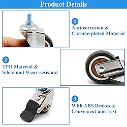Especificaciones: Material: TPR, rodamiento de acero. Cantidad: 4 unidades. Tamaño de la rueda: 2 pulgadas. Capacidad de carga: 35 kg (cada uno). Capacidad de carga total: 140 kg (recuento de 4). El paquete incluye: 4 ruedas giratorias para muebles (2 con freno, 2 sin freno). Nota: 1. Antes de comprar, mide el tamaño de los agujeros para muebles y el tamaño y la capacidad de carga de las ruedas para evitar problemas innecesarios. 2. Ruedas con freno: se requiere un poco de fuerza para presionar el freno. 3. Si recibes una rueda de mueble dañada, ponte en contacto con nosotros.