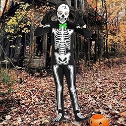 SaiXuan Disfraz Esqueleto Niño Luminoso, Disfraz Halloween Niño Glow in the Dark con Mono Completo, Capucha, Guantes y Cubrepiés, Vestido Esqueleto 6-12 Años Unisex para Fiestas de Disfracesy Cosplay