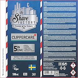 THE SHAVE FACTORY Spray desinfectante 5 en 1 para máquinas cortapelos 500 ml Eficiencia multifunción: combina refrigeración, limpieza, desinfección, lubricación y prevención de oxidación en un potente spray. Gran volumen de 500 ml: proporciona una cantidad generosa para un uso prolongado, lo que