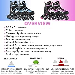 Adecuado para jóvenes y mayores: los patines en línea TOMSHOO están disponibles en cuatro tamaños ajustables, por lo que no tienes que preocuparte por tus pies. Actualmente, los patines están disponibles en tres tallas S/M/L que son adecuados para las tallas de pie 28 39 UE. Seguridad: la cabeza y el tobillo de los patines están envueltos firmemente en una carcasa dura para proteger mejor a los principiantes, mientras que las formas más maduras se utilizan para garantizar que los niños disfruten de un patinaje seguro y suave. Liberación rápida: los patines se fijan con velcro y hebillas de trinquete para garantizar un mejor ajuste y evitar esguinces por aflojamiento y al mismo tiempo garantizar un desgaste más rápido. Forro cómodo: el zapato está forrado con un forro que absorbe el sudor y está envuelto en algodón suave que proporciona una envoltura ajustada y un agarre fuerte, reduciendo así la resistencia y la fatiga al patinar. Juguete y regalo ideales: la sutil pero estéticamente agradable mezcla de negro y otros colores es adecuada para personas de todas las edades y es perfecta para mejorar el equilibrio, la agilidad, la fuerza y la resistencia, pero también como un regalo ideal para otros.