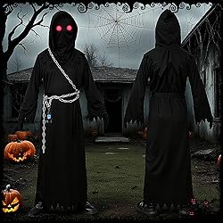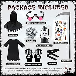 TOYTOPIE Disfraz de Parca de Halloween, Traje de Miedo Niños y Niñas con Guadaña, Gafas Brillantes, Guantes Esqueleto para Fiestas Halloween y Carnaval (5 a 10 Años)