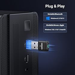 Adaptador Bluetooth 5.3 para una transmisión más rápida y estable. Admite transferencia de documentos y audio. Puede conectar 5 dispositivos diferentes al mismo tiempo, puede emparejarse con teléfonos, auriculares, parlantes, teclado y mouse. Satisfaga las necesidades de su oficina. Mantenga presionado el botón durante 3 segundos para cambiar el adaptador a Ratón Inteligente Jiggle. El modo adaptador y el modo jiggle ratón no se pueden usar al mismo tiempo, cuando cambia al modo jiggle ratón, todos los dispositivos Bluetooth conectados se desconectarán. En el modo Jiggle Ratón, se reconoce como un mouse normal y la computadora siempre permanece activa y la pantalla de la computadora no se apaga incluso si no realiza ninguna operación. En el modo Jiggle Mouse, puede hacer clic en el botón multifunción para cambiar al modo Jiggle ligero o al modo aleatorio de pantalla completa. Ajuste a voluntad, más cómodo de usar. En modo Bluetooth, el adaptador solo es compatible con el sistema Windows 8.1/10/11, ¡no es compatible con otros sistemas! En el modo jiggle ratón, el adaptador es compatible con Windows 7/8.1/10/11 y MacOS.