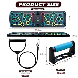 Tabla plegable para flexiones Material: ABS Dimensiones: 63,5 x 18 x 1,8 cm Color: negro Contenido: 1 tabla para flexiones, 2 asas antideslizantes, 2 bandas de resistencia