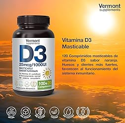 Vitamina D 1000UI - 120 Comprimidos Masticables de Vitamina D3 Sabor Naranja | Huesos y Dientes más fuertes, Favorece al funcionamiento del Sistema Inmunitario - Vermont Supplements