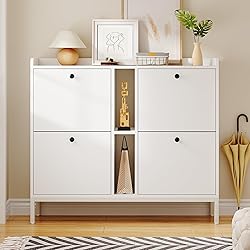 YITAHOME Zapatero Estrecho con 4 Solapas, 108 x 27,5 x 97,5 cm para 16 Pares de Zapatos con 2 estantes Abiertos, Zapatero Blanco, Armario para Pasillo, cómoda para Zapatos en el Pasillo