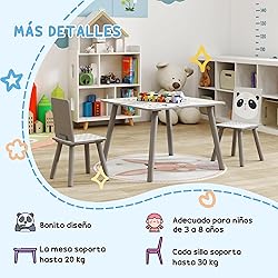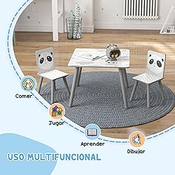 Terminar los deberes, dibujar, colorear, jugar y merendar… ¡El día a día de nuestros hijos siempre está lleno de actividades! Ayúdalos a realizarlas todas con total comodidad con este conjunto de mesa infantil con sillas de ZONEKIZ. Hecho de MDF y patas de madera de pino, el respaldo de las sillas y la encimera de la mesa presentan un bonito estampado con cenefas y pandas, que llamará la atención de los más pequeños. Características: ● Conjunto de 3 piezas compuesto por 1 mesita y 2 sillas a juego ● Con patas de color gris y estampado con cenefas y pandas ● Altura adecuada para niños a partir de 3 años ● Esta mesa infantil es ideal para dormitorios infantiles, aulas o zonas de juego ● Muebles infantiles hechos de MDF de 12 mm de espesor con superficie pintada y tratada por transferencia de calor y patas de madera de pino ● Material certificado y bordes redondeados que son seguros para tus hijos ● Nota Importante: No realizamos envíos a las Islas Canarias, Ceuta y Melilla, ni a las Azores y otras islas de Portugal Especificaciones: ● Color: gris y blanco ● Material: MDF, madera de pino ● Medidas de la mesa: 60x60x44 cm (LxANxAL) ● Medidas de las sillas: 26,5x26,5x50 cm (LxANxAL) ● Medidas de los asientos: 26,5x22,5x26 cm (LxANxAL) ● Medidas de los respaldos: 29x24,5 cm (LxAL) ● Carga máxima: 20 kg (mesa), 30 kg (cada silla) ● Grosor del tablero: 12 mm ● Edad recomendada: a partir de 3 años ● Referencia: 312-102V00GY ● 1 x Mesa ● 2 x Silla ● 1 x Manual de instrucciones