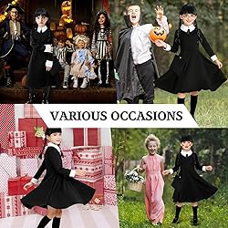 Disfraz de Halloween para niña Disponible en tres tallas. Consulta la tabla de tallas cuidadosamente antes de comprar para asegurarte de que te quede perfecto. Ideal para juegos de rol, carnaval, Halloween, Navidad, fiestas temáticas, cumpleaños, Mardi Gras, comuniones, sesiones de fotos, espectáculos u otras celebraciones. Recibirás: 1 x Vestido negro 1 x Peluca realista con redecilla 1 x Collar 1 x Par de calcetines 1 x Bolsa Importante: Para garantizar la durabilidad de la prenda, recomendamos lavarla a mano con agua fría. No uses lejía ni agua caliente, ya que dañará la prenda.